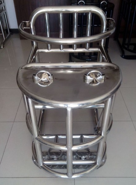 采用優(yōu)質(zhì)不銹鋼材料制作而成,人性化設(shè)計(jì),an全性能可靠,四角安*全固定于地面,重量為50KG. 成比例加大,此造型可做鐵制和不銹鋼兩種,腰部原來的安*全帶換成鐵管安*全杠,椅子一側(cè)有彈性開關(guān),用腳一踩前方籠型門 便可打開 ,當(dāng)籠型門關(guān)閉時(shí)腳部?jī)森h(huán)正好吻合,不易變形掙脫,腳底踩花紋板之上,有效防止被審訊人腳凳使椅子移動(dòng),前方固定有鎖具與其它椅相同