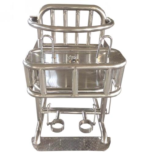 操作:右手扳動椅背后方手柄,前方桌面可自然打開同時腳步約束環(huán)也隨之打開,然后按動椅背胸帶基座后方開關裝置,打開胸帶,罪犯入座后關上桌門,扳動后方手柄,桌門腳部約束環(huán)會同時鎖住,然后將其手kao鏈條移至桌面上方,專用鎖具鎖住,然后將胸部約束帶調節(jié)至適當位置鎖住,整個操作過程在20秒內可以完成。