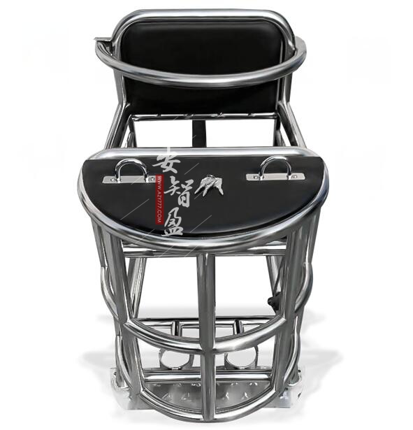3、結(jié)構(gòu):訊問椅由座板、靠背、臺(tái)板、扶手、腰環(huán)、U型鎖kao、腳環(huán)等組成,臺(tái)板下方為籠式框架,與臺(tái)板成一體,可限制目標(biāo)人腿部運(yùn)動(dòng)范圍,腰部有不銹鋼約束環(huán)。靠背、座板、臺(tái)板用海綿覆皮革成軟包。椅腿下方裝有直接與地面固定底盤。