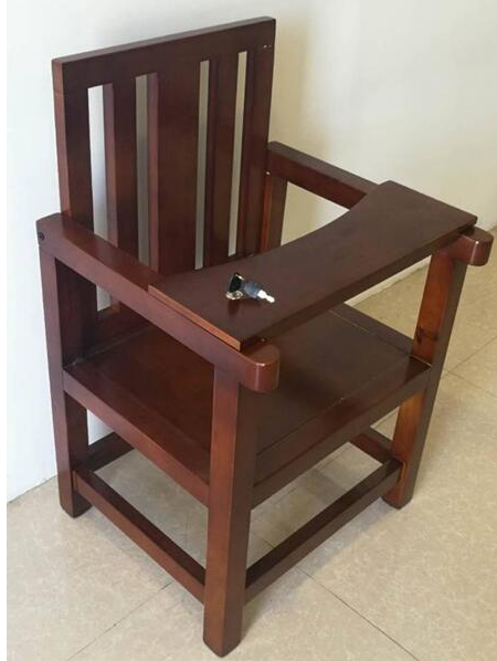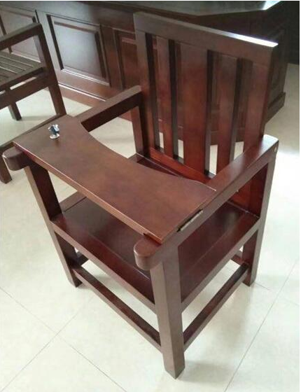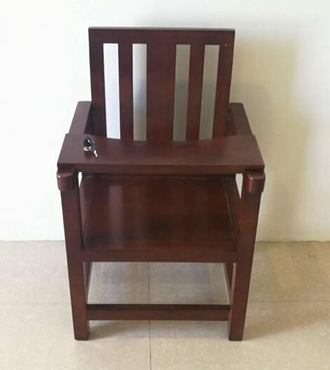 椅子采用實(shí)木支架,基材采用全實(shí)木,經(jīng)高溫沸煮及脫水達(dá)到定型后不開裂,不變形。面板油漆采用環(huán)保油漆,達(dá)到環(huán)保標(biāo)準(zhǔn)。審訊椅各棱角處為圓滑處理??晒潭ㄓ诘孛?。