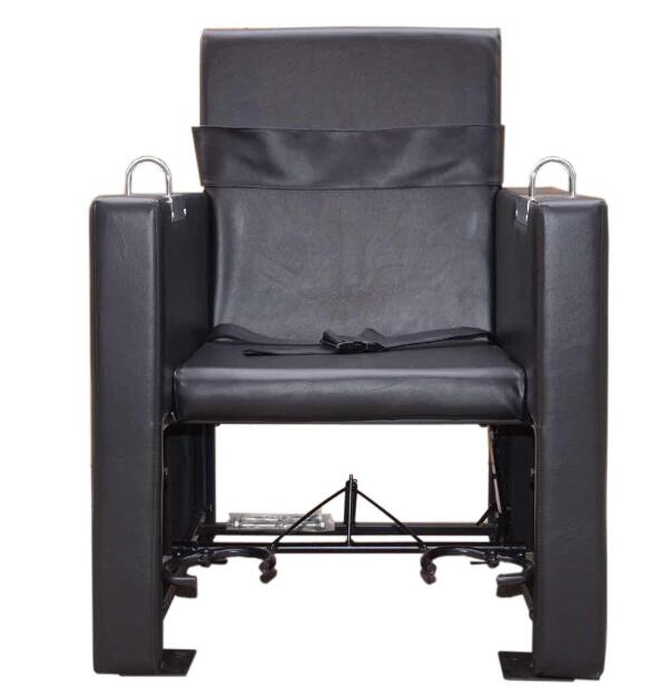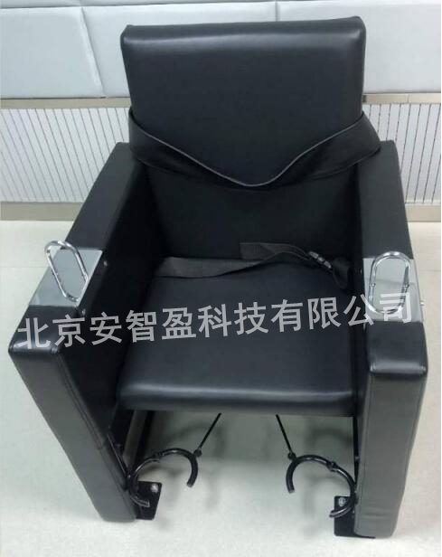 4、特性:審訊椅手部采用U型鎖約束,U型鎖下按至合適位置將嫌疑人手部鎖住,扶手部位寬度便于簽字書寫;胸部及腰部以約束帶束縛;腿部以環(huán)形腳踏鎖,警員在椅后用腳踏可將鎖打開,嫌疑人小腿置入,踩踏鎖上,操作方便。