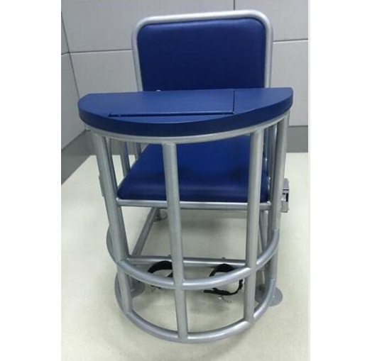 此款審訊椅鐵管制作,電鍍銀色,座椅前端設(shè)有方形小桌整體開(kāi)關(guān)的一些裝置,下方設(shè)有約束帶。桌面添加寫(xiě)字板,掀開(kāi)是犯人簽字的小桌板。靠背、座面、桌面采用西皮軟包。結(jié)構(gòu)設(shè)計(jì)合理,全縫焊接,堅(jiān)固耐用。