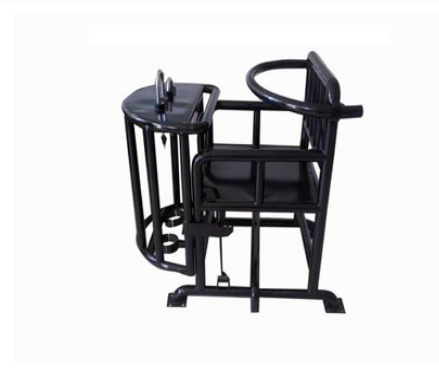 靠背、座面、椅腿、扶手及胸部約束環(huán)另外包括座椅前設(shè)有整體弧形開關(guān)裝置。其桌面上方裝有U型鎖具,方便約束其手腕。椅腿下方裝有直接與地面固定底盤。