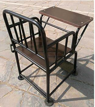 此審訊椅靠背高度為103mm,寬為590mm,椅腿長為750mm,小桌長:500mm ,小桌寬:280mm,地面離座面高:550mm ,座面至背面高:500mm。