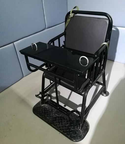 此椅在,座位和后背加裝軟包坐墊,椅子一側(cè)有彈性開關(guān),用腳一踩前方籠型門 便可打開,當(dāng)籠型門關(guān)閉時(shí)腳部兩環(huán)正好吻合,不易變形掙脫,前方固定有鎖具,與其它椅相同,舒適大方.