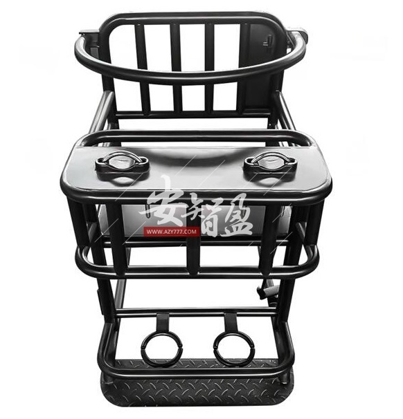 10. 操作方法:一側(cè)有彈性開關(guān),用腳一踩前方籠型門 便可打開,當(dāng)籠型門關(guān)閉時腳部兩環(huán)正好吻合,不易變形掙脫,前方固定有鎖具,與其它椅相同;輕踩左下方的小踏板,桌框門自動彈開將犯罪嫌疑人關(guān)至本器械,關(guān)上弧形桌框門就可以將犯罪嫌疑人腳部約束,打開桌面U型鎖環(huán)把犯罪嫌疑人手腕放至環(huán)內(nèi)輕松按下約束環(huán),調(diào)節(jié)至適當(dāng)檔位即可。
