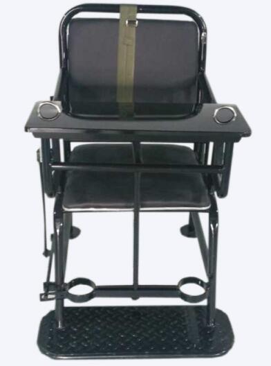 審訊椅采用上層鐵藝,包括靠背、座面、椅腿、扶手及胸部固定帶,座椅前端設(shè)有方形小桌整體開關(guān)的一些裝置,下部設(shè)有腿部固定裝置,結(jié)構(gòu)設(shè)計合理,固定安全可靠,全縫焊接,堅固耐用.