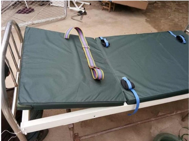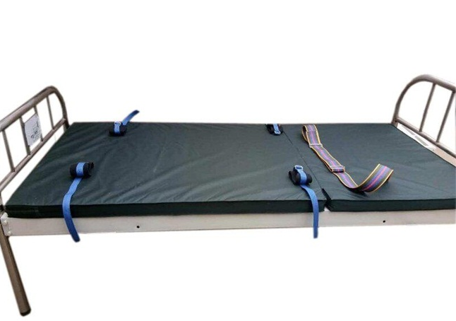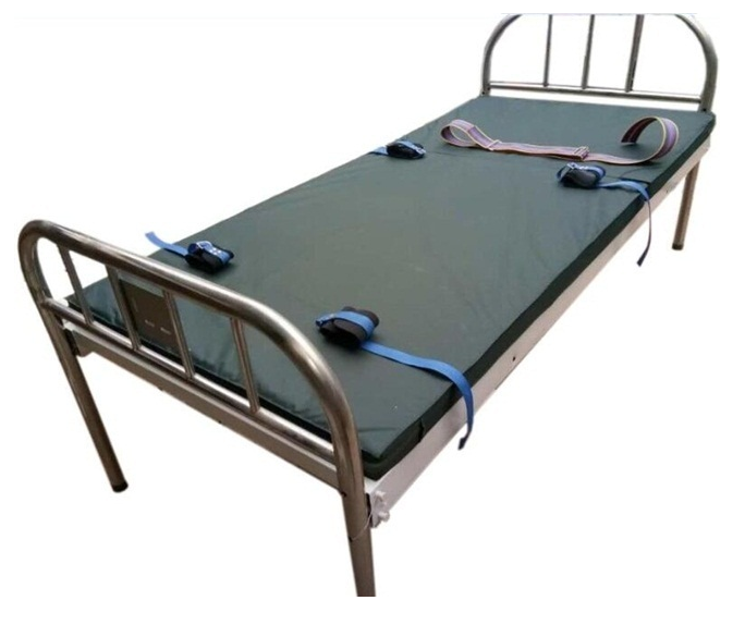 該約束床包括床架、固定于床架上的床板,床板上根據(jù)患者躺臥的足踝部、手腕部、胸部位置分別固定有約束帶。本實(shí)用新型結(jié)構(gòu)合理、科學(xué),使用方便、安全、有效,亦可稱為“保護(hù)床”,主要用來對(duì)興奮、沖動(dòng)、傷人、毀物、自殺、自傷、違拗、治療欠合作的病人和毒癮發(fā)作的戒毒人員進(jìn)行約束,在其對(duì)自身或者周圍安全造成影響時(shí)加以干涉,避免意外發(fā)生。